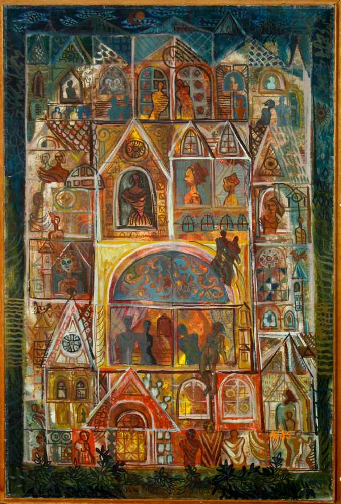 “The flow of the figures across the painting's surface keeps the eye moving horizontally and vertically in a manner peculiar to a 16th century tapestry. Although the figures are only suggested, they create a superb illusion of human an celestial activity in the context of medieval tournament. Adonyi endows the imagery with unexpected animation by assembling a multitude of human profiles facing different directions. The flatness of the icon image, negating volume and space, is particularly suited to Adonyi's work." (Jacqueline Hall, 1986)